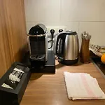 Denna lägenhet har också ett kök-vardagsrum försett med kaffe/tebryggare, ugn och glasföremål.